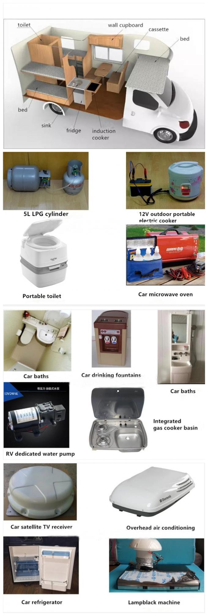 مضخات وأنابيب وربط الطريق السريع الجهاز ، صنبور ، بالوعة ، سخان المياه ، المرحاض ، دش ، ثلاجة السيارة ، تكييف هواء السيارات ، البطاريات ، مولدات ، جميع أنواع الأسلاك ، العاكسون ، مختلف من مقبس المقطورة ، موصل الفرامل متزامنة ، خطوة المحرك ، سخان ، موقد ، استقبال الأقمار الصناعية طبق ، المظلات ، الأبواب ، النوافذ ، مناور ، مراوح التهوية ، الدعامات دراجة.